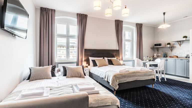 Die SERENITY Aparthotels - Old Town Poznan by Friendly Apartments zeichnen sich durch modern ausgestattete Unterkünfte aus. Es steht ein Restaurant zur Verfügung, das Gästen eine à la carte Frühstücksoption bietet. Die Unterkunft bietet zudem kostenloses WLAN und verschiedene Annehmlichkeiten wie Zimmerservice, Parkmöglichkeiten und eine Gemeinschaftsküche. Der Check-in ist ab 16:00 Uhr möglich, und der Check-out muss bis 11:00 Uhr erfolgen. Das Hotel ist eine Nichtraucherunterkunft und Haustiere sind auf Anfrage gestattet.