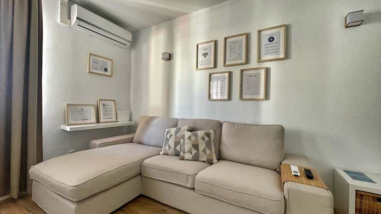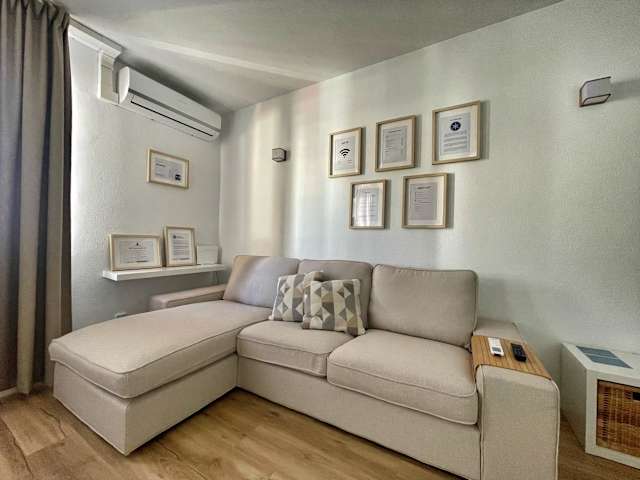 Die Ferienwohnung verfügt über ein Schlafzimmer, eine Klimaanlage, einen Flachbild-TV sowie eine komplett ausgestattete Küche mit Kühlschrank und Mikrowelle. Handtücher und Bettwäsche werden bereitgestellt.