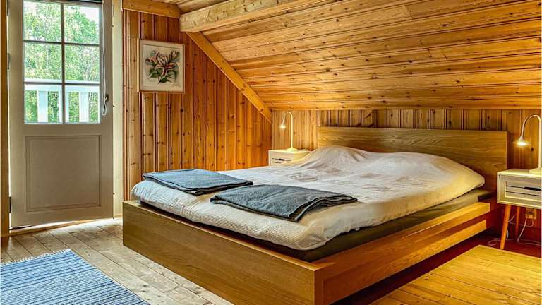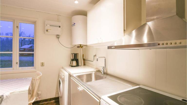 Das Ferienhaus verfügt über zwei Schlafzimmer und ein Wohnzimmer mit einem Fernseher. Zudem gibt es eine voll ausgestattete Küche mit einem Kühlschrank.