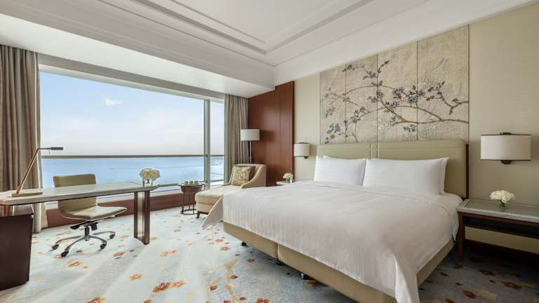 Die klimatisierten Zimmer des Hotels bieten einen Balkon und einen herrlichen Blick auf die Stadt oder den Golf von Bohai. Zur Ausstattung gehören ein Flachbild-TV, eine Minibar, ein Kühlschrank, ein Safe und ein Wasserkocher. Im eigenen Bad finden Sie Hausschuhe und Pflegeprodukte vor.