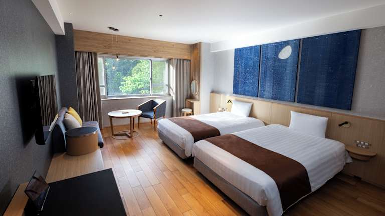 Die klimatisierten Zimmer sind entweder im westlichen Stil mit Kingsize-Bett oder im japanischen Stil mit Futonbetten eingerichtet. Zur Ausstattung gehören ein Flachbild-TV, ein Kühlschrank, japanische Yukata-Bademäntel, ein Safe, ein Luftbefeuchter und ein eigenes Bad. In den Badezimmern stehen Haartrockner sowie Kosmetikartikel bereit, und es gibt sowohl Nichtraucher- als auch Raucherzimmer.