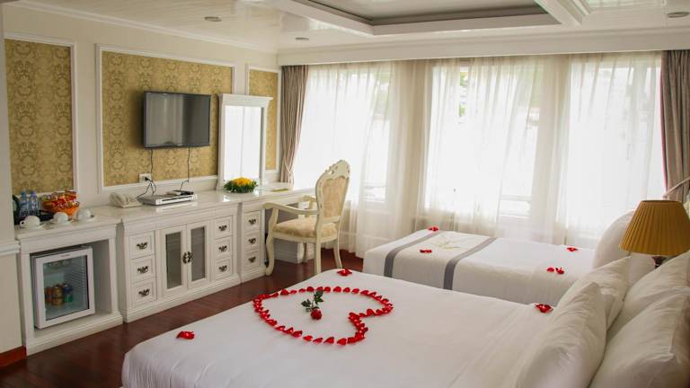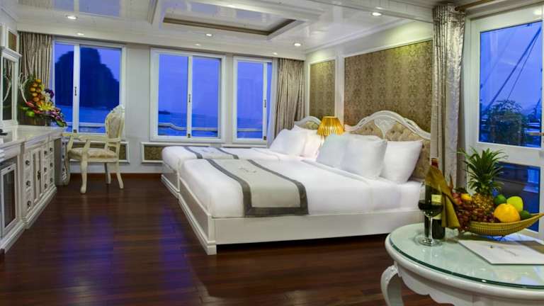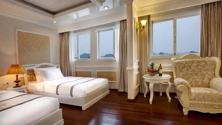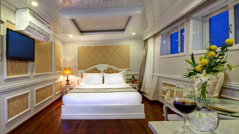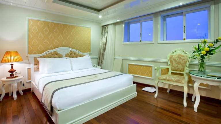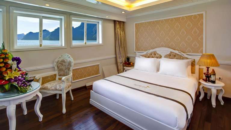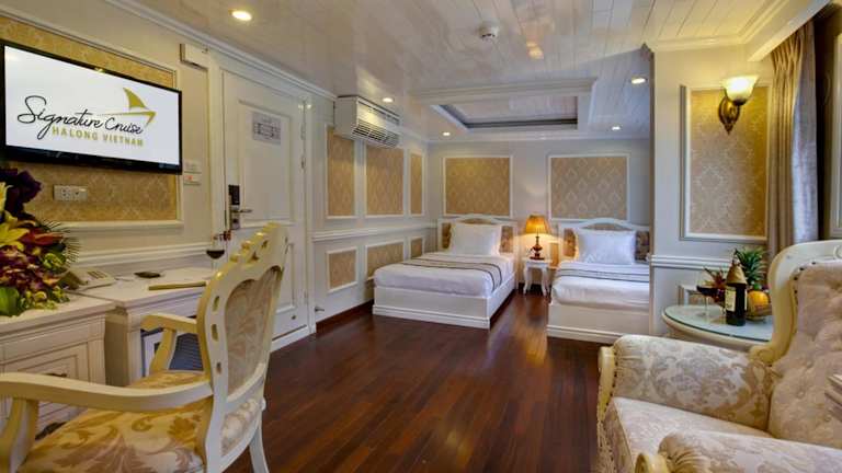 Die luxuriösen Suiten der Signature Halong Cruise bieten einen herrlichen Blick auf die Bucht Ha Long und die Bucht Lan Ha. Die Suiten sind im französischen Stil gehalten und verfügen über Annehmlichkeiten wie Klimaanlage, Parkettboden, einen Kleiderschrank, eine Sitzecke und einen Flachbild-Kabel-TV. Ein Safe und eine Minibar sind ebenfalls vorhanden. Das private Badezimmer ist mit einer Badewanne, einem Haartrockner, Hausschuhen und kostenlosen Pflegeprodukten ausgestattet.