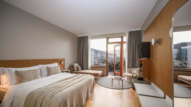 Die Zimmer sind mit einem Flachbild-Sat-TV, Kaffee- und Teezubehör sowie einer eigenen Terrasse mit Blick auf den vulkanischen Horizont ausgestattet. Jedes Zimmer verfügt über ein eigenes Badezimmer mit einer ebenerdigen Dusche, in dem Bademäntel und Hausschuhe bereitliegen.