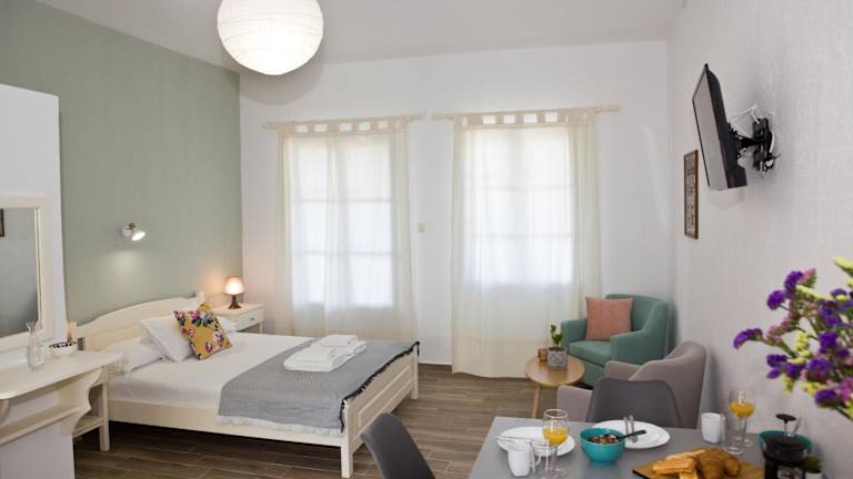 Die Studios im Skalopati Studios & Villa sind einfach eingerichtet und verfügen über eine Küchenzeile mit Kühlschrank und Herdplatten, so dass Sie Ihre Mahlzeiten selbst zubereiten können. Jedes Zimmer ist klimatisiert und bietet einen Balkon mit Blick auf die Ägäis. Ein TV und ein eigenes Bad mit kostenfreien Pflegeprodukten sind ebenfalls vorhanden.