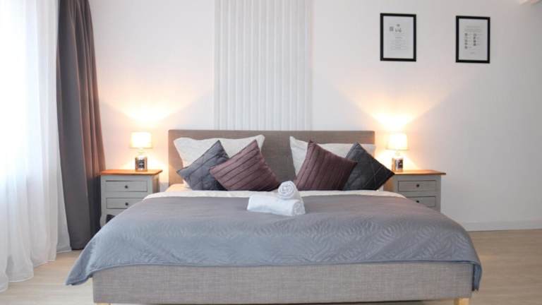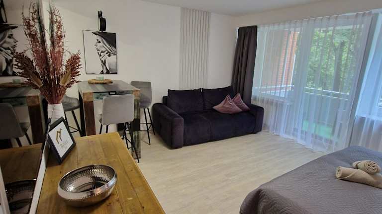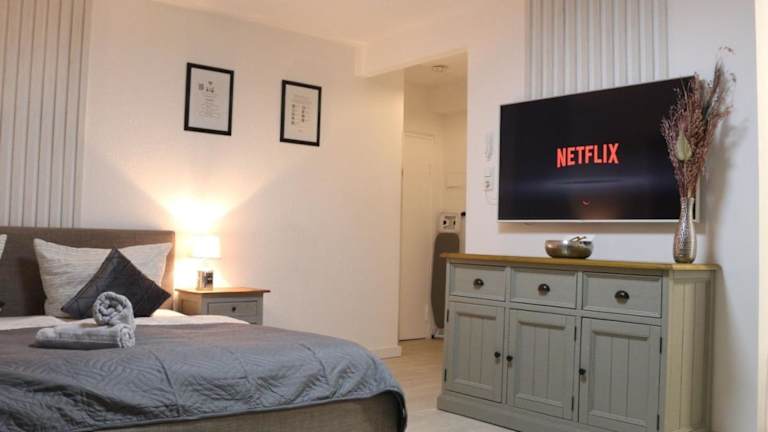 Die klimatisierten Zimmer des Sky Inn - nahe Messe contactless check in verfügen über einen Balkon und eine Gemeinschaftslounge. Das Apartment ist mit einem Flachbild-Kabel-TV ausgestattet. Die Küche bietet alles, was Sie für einen angenehmen Aufenthalt benötigen, darunter einen Kühlschrank, eine Mikrowelle und ein Kochfeld. Das Badezimmer verfügt über eine Dusche mit kostenfreien Pflegeprodukten und einem Haartrockner. Kostenfreies WLAN ist in der gesamten Unterkunft verfügbar.