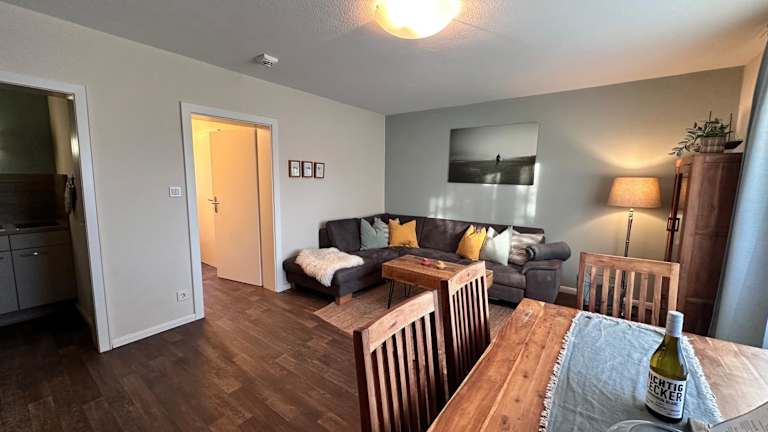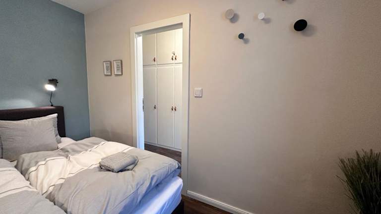 Die Ferienwohnung bietet ein Schlafzimmer, ein Wohnzimmer mit Flachbild-TV sowie ein Badezimmer mit Dusche. Handtücher und Bettwäsche werden bereitgestellt.