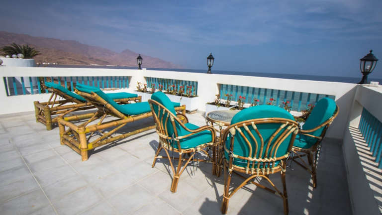 Die klimatisierten Zimmer im Skyrock Dahab sind komfortabel und bieten eine Terrasse oder einen Balkon mit herrlichem Blick auf das Meer und die Berge. Jedes Zimmer verfügt über einen gemütlichen Sitzbereich, einen Flachbild-Sat-TV und eine praktische Küchenzeile mit Kühlschrank, Mikrowelle, Kochfeld und Wasserkocher.
