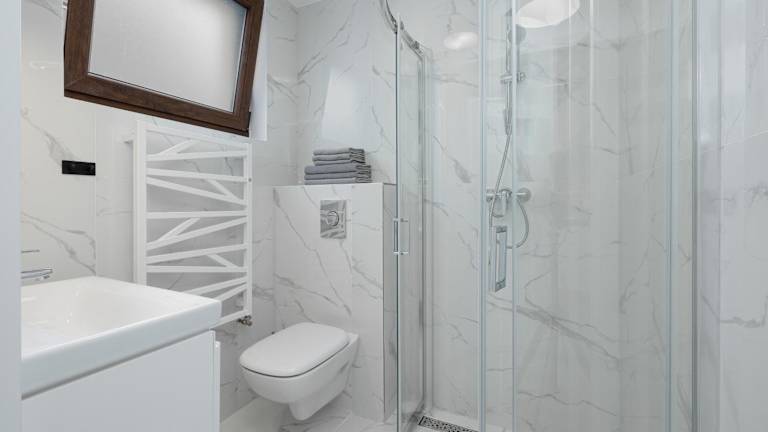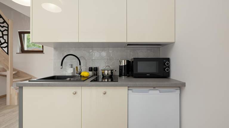Alle Wohneinheiten in SŁONECZNE TARASY verfügen über eine Terrasse, eine Küche mit Kühlschrank und Herdplatte sowie ein eigenes Badezimmer mit Dusche.