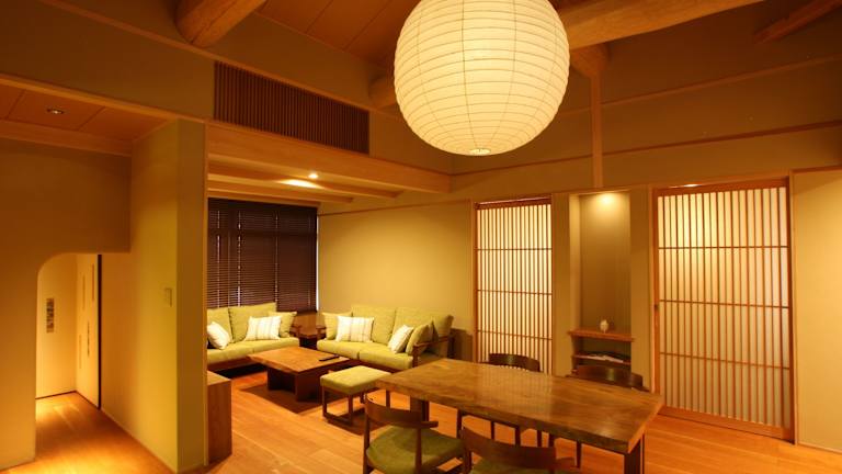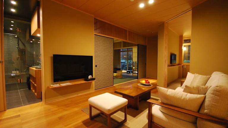 Die Suiten im Small Luxury Ryugin bieten geräumige und komfortable Wohnbereiche. Das japanische Zimmer ist mit traditionellem Tatamiboden und Futonbetten ausgestattet, während das Wohnzimmer mit Holzboden, bequemen Sofas und einem Flachbild-TV zum Entspannen einlädt. Das Badezimmer ist mit hochwertigen Holzmöbeln, zwei Waschbecken und einer ebenerdigen Regendusche ausgestattet. Jede Suite bietet den Gästen einen luxuriösen Rückzugsort, um nach einem erlebnisreichen Tag in Kyōto zu entspannen.
