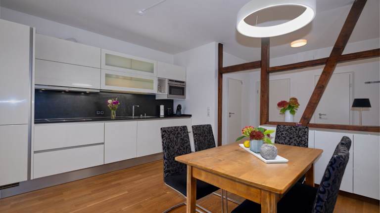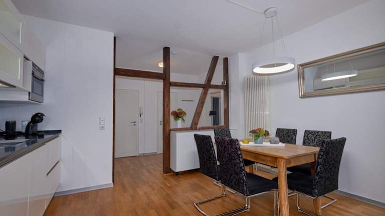 Die Ferienwohnung umfasst zwei Schlafzimmer, eine voll ausgestattete Küche mit Kühlschrank und Geschirrspüler, sowie einen Flachbild-TV und einen Sitzbereich. Das Badezimmer ist mit einer Dusche ausgestattet. Handtücher und Bettwäsche werden bereitgestellt.