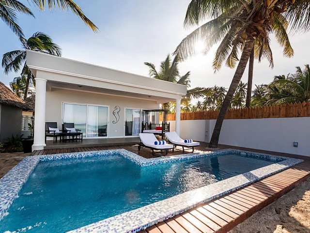 Das Sofia Sea View Hotel in Pwani Mchangani bietet Ihnen einen unvergesslichen Aufenthalt in einem malerischen Fischerdorf im Nordosten der Insel Sansibar. Mit einem eigenen Strand und einem ganzjährig geöffneten Außenpool können Sie hier Entspannung pur genießen. Die Zimmer sind klimatisiert und verfügen über moderne Badezimmer mit ebenerdiger Dusche und kostenlosen Pflegeprodukten. Das Hotel bietet Ihnen ein vielfältiges Frühstück mit kontinentalen und vegetarischen Optionen. Im hoteleigenen Restaurant können Sie sich auf mediterrane Küche, Fisch und Meeresfrüchte spezialisieren. Erleben Sie authentische lokale Erlebnisse im Fischerdorf und entdecken Sie die Schönheit von Zanzibar.