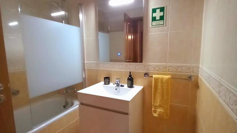 Die Ferienwohnung verfügt über 1 Schlafzimmer, ein Wohnzimmer, einen Essbereich und eine Küche mit Kühlschrank. Zur Ausstattung gehören zudem ein Flachbild-TV, Klimaanlage, Handtücher und Bettwäsche. Es sind Gartenmöbel vorhanden.