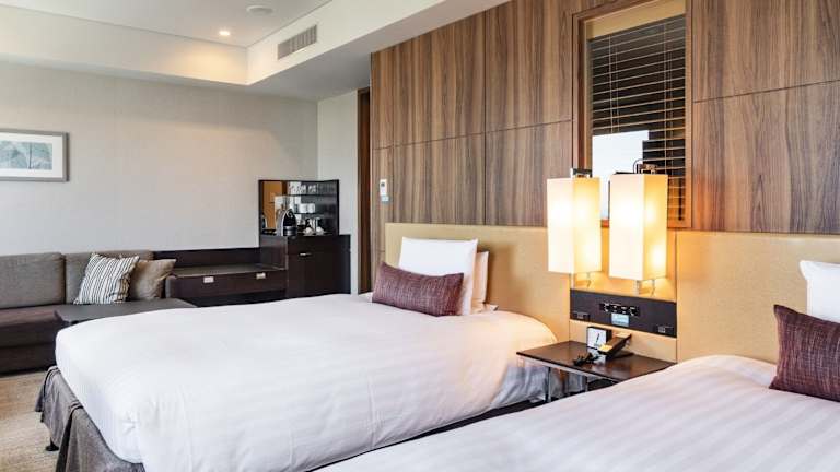 Die Zimmer des Solaria Nishitetsu Hotels sind modern gestaltet und verfügen über Klimaanlage, Heizung sowie ein Doppel- oder Queensize-Bett. Ausstattungen wie ein Kühlschrank, ein Safe, ein Telefon, ein TV-Gerät und kostenloses WLAN sind vorhanden. Die Badezimmer sind mit einer Dusche, Badewanne und einem Haartrockner ausgestattet. Außerdem bieten einige Zimmer Ausblicke auf den Vulkan Sakurajima.