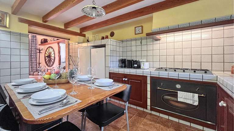 Das Ferienhaus umfasst fünf Schlafzimmer und verfügt über einen Essbereich und ein Wohnzimmer. Die Küche ist mit einem Kühlschrank ausgestattet.