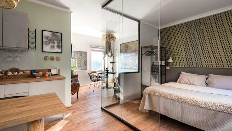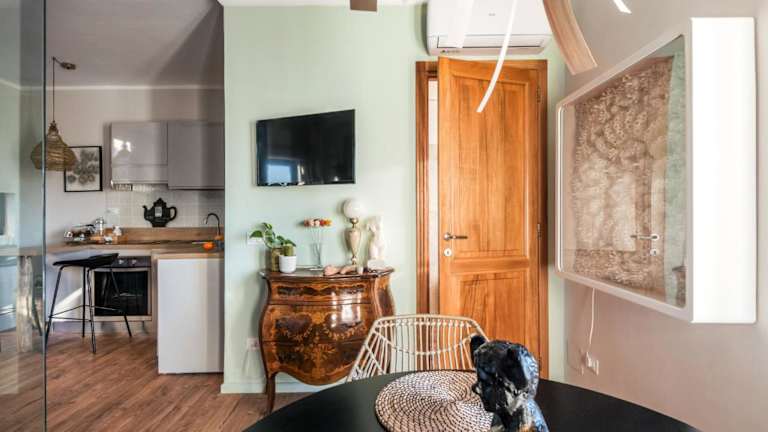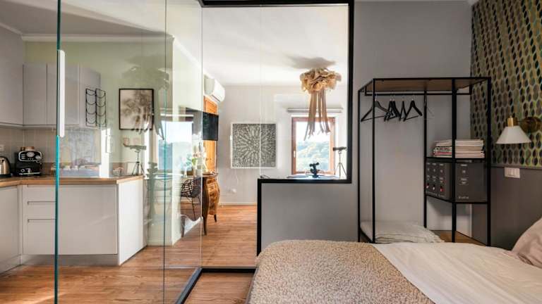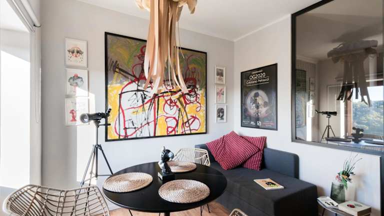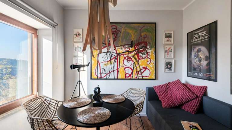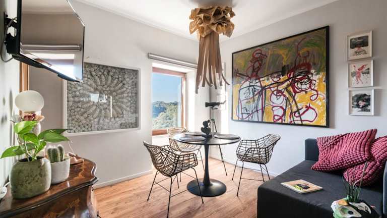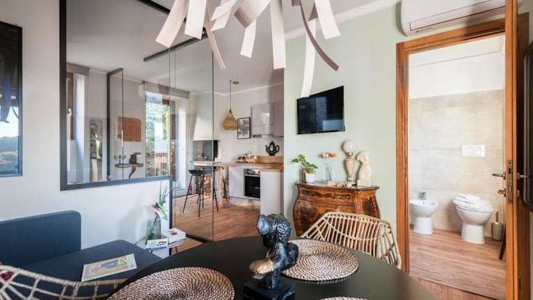 SopraBosco Calcata Art & Design Apartment bietet Übernachtungsmöglichkeiten in einer modernen Ferienwohnung mit einer Terrasse und Stadtblick. Kostenloses WLAN ist in der gesamten Unterkunft verfügbar. Die Wohnung ist klimatisiert und besteht aus einem Schlafzimmer sowie einem Wohnzimmer.