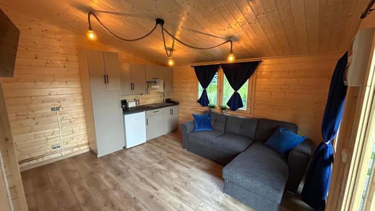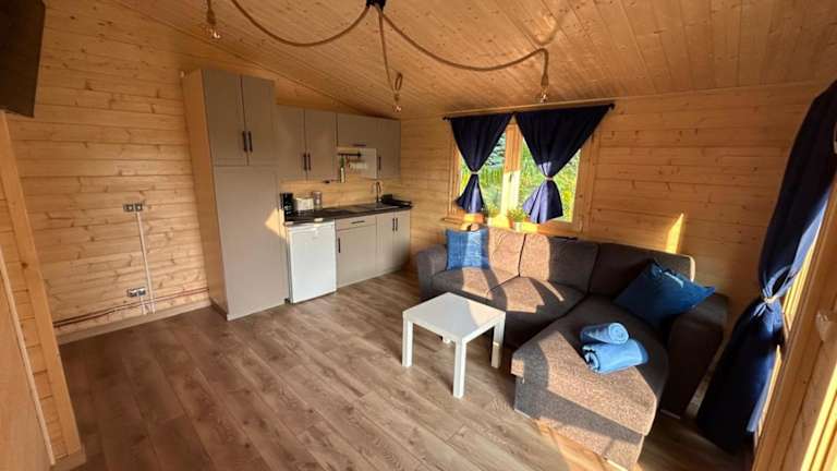 Die Küchenzeile im Ferienhaus ist gut ausgestattet und verfügt über einen Kühlschrank sowie eine Herdplatte, es sind jedoch keine spezifischen Verpflegungsoptionen angegeben.
