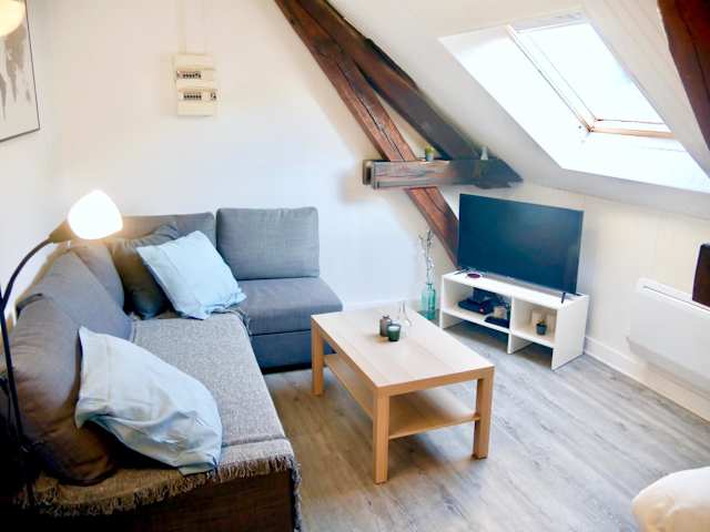 Die Ferienwohnung der Unterkunft verfügt über ein Schlafzimmer, einen Flachbild-TV, einen Essbereich, eine Küche mit Kühlschrank und ein Wohnzimmer.