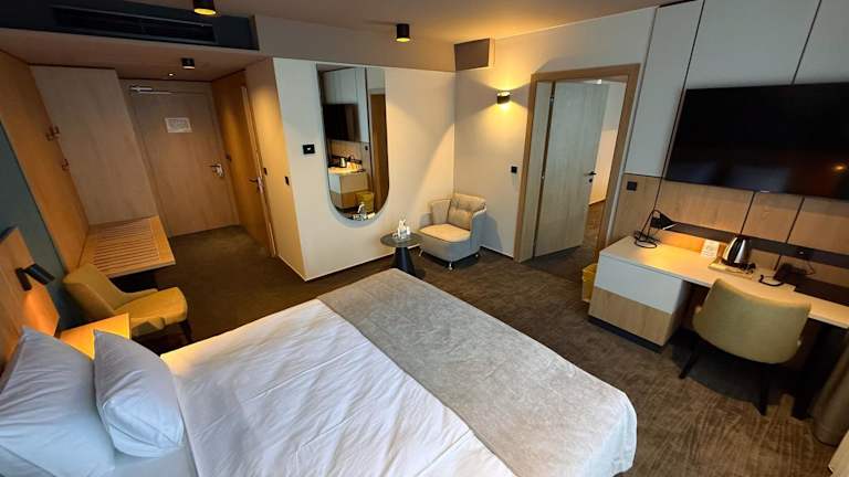 Das Spa & Wellness Hotel Paradiso befindet sich in einer günstigen Lage in der Nähe der Autobahn A2 und am Rande der Region Posavje. In unmittelbarer Nähe finden Sie den Bahnhof Dobova und die kroatische Hauptstadt Zagreb ist nur 25 km entfernt. Die Umgebung des Hotels bietet eine malerische und üppig bewachsene Landschaft mit Flüssen, Tälern, Wäldern und Weinbergen. Ein 18-Loch-Golfplatz ist nur wenige Kilometer entfernt und das mittelalterliche Schloss Otočec, das im Jahr 1252 erbaut wurde, ist in einer 30-minütigen Autofahrt erreichbar.