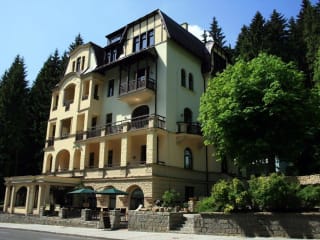 Der luftige und helle Reha Komplex mit Ausblick durch die eingebaute Glaswände in die freie Natur, ist mit modernster Rehabilitationstechnik ausgestattet, womit sich eine ganze Reihe von Heil und Wellness Anwendungen anbieten wie z. B.: Bäder, klassische und untraditionelle Massagen, Gasinjektionen und Gasumschläge, Elektrotherapie, Sauerstofftherapie und Inhalationen, Thermotherapie, Lasertherapie, Lymphdrainagen, Wassergymnastik usw. Zur Verfügung steht ein Arzt, der nach der Eingangsuntersuchung für Sie einen optimalen Heilvorgang und die dazu passende Diät bestimmt. In der Spa Gallery befindet sich eine trockene Sauna, ein Schwimmbad von 10 x 5 M. mit Gegenstrom und Massagedrüsen und Wasserfall. Durch die Glaswand kann man einen angenehmen Ausblick in den Waldpark geniessen.Bestandteil des Hotels ist ein Kosmetiksalon, im welchem eine professionell geschulte Kosmetikerin Gesichtshaut und den ganzen Körper mit luxuriöser französischer Kosmetik SOTHYS Paris behandelt. Bestandteile des Hotels sind: Rezeption, Restaurant und Café BOHEME mit Sommer- und Winterterrasse, Bäderabteilung, Kosmetik, Pediküre, Parkplatz mit Kameraüberwachung, Aufzug und Fahrradverleih. Alle Dienstleistungen können mit der Kreditkarte bezahlt werden.