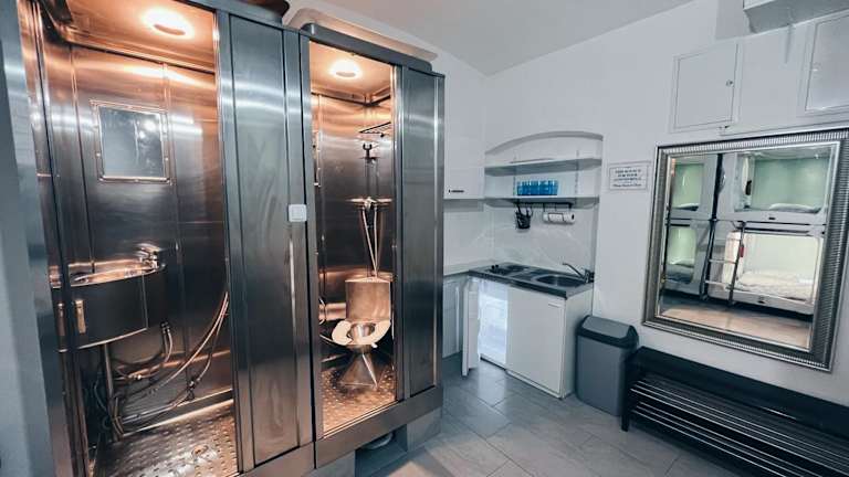Die Ferienwohnung umfasst ein Schlafzimmer. Die weitere Ausstattung umfasst eine Küche sowie zwei Badezimmer, die praktischen Komfort bieten.