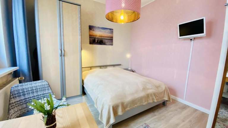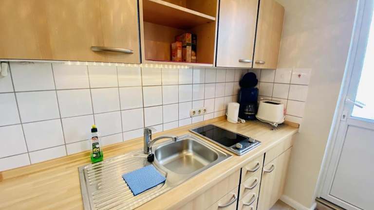 Die Ferienwohnung verfügt über ein Schlafzimmer, einen Fernseher mit Kabelkanälen sowie eine gut ausgestattete Küchenzeile mit Kühlschrank und Toaster. Das Badezimmer ist mit einer Dusche ausgestattet.