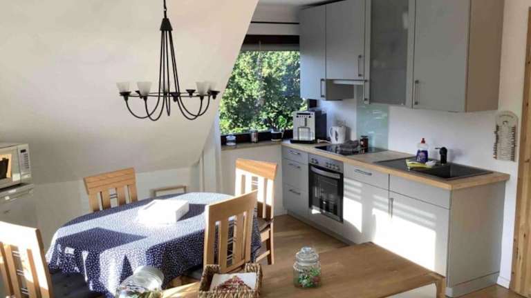 Die Ferienwohnung umfasst eine voll ausgestattete Küche mit Kühlschrank und Kaffeemaschine. Essmöglichkeiten sind nicht gesondert erwähnt, jedoch bietet die Küche Möglichkeiten zur Selbstverpflegung.