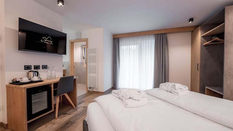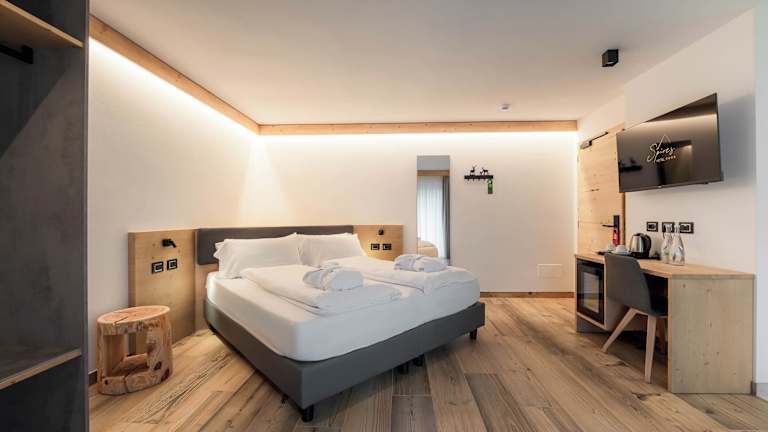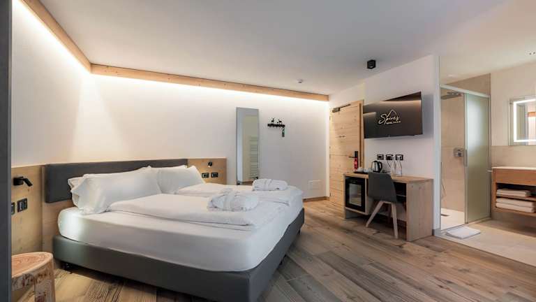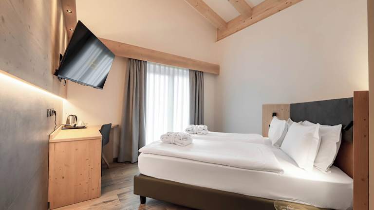 Die Zimmer sind mit Heizung, Teppichböden, einem Doppelbett oder einem Queensize-Bett, einem Balkon mit Bergblick sowie einem eigenen Badezimmer ausgestattet. Zur weiteren Ausstattung gehören ein Flachbild-TV, ein Kühlschrank, ein Safe, ein Schreibtisch und ein Haartrockner. Die Badezimmer sind mit Kosmetikartikeln und einer Auswahl an Handtüchern ausgestattet.