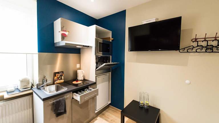 Die Wohneinheiten im Splendide Studio Centre Colmar sind modern eingerichtet und bieten den Gästen einen komfortablen Aufenthalt. Die Apartments verfügen über Parkettböden und einen gemütlichen Sitzbereich. Die voll ausgestattete Küche bietet alles, was man für die Zubereitung von Mahlzeiten benötigt, einschließlich eines Kühlschranks, eines Geschirrspülers, eines Backofens, einer Mikrowelle, einer Kaffeemaschine und eines Wasserkochers. Ein Essbereich ist ebenfalls vorhanden. Zur Ausstattung gehören auch ein Flachbild-Sat-TV und ein eigenes Bad mit Dusche und kostenfreien Pflegeprodukten.