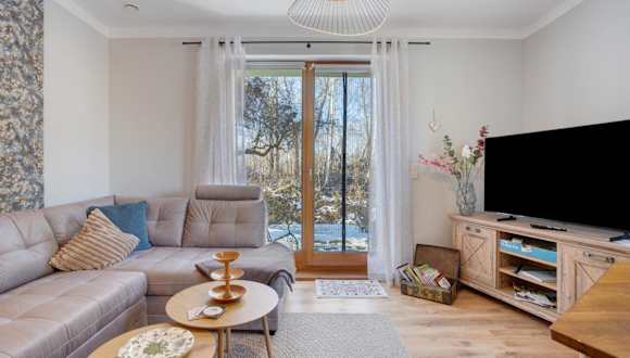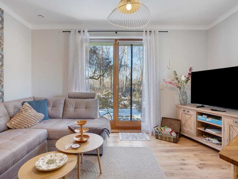 Die Ferienwohnung umfasst ein Schlafzimmer, ein Wohnzimmer sowie eine gut ausgestattete Küche mit Kühlschrank und Geschirrspüler. Des Weiteren gibt es ein Badezimmer mit Dusche. Zur Ausstattung gehören ein TV sowie Handtücher und Bettwäsche. Eine Terrasse mit Blick auf den Fluss ist ebenfalls vorhanden.