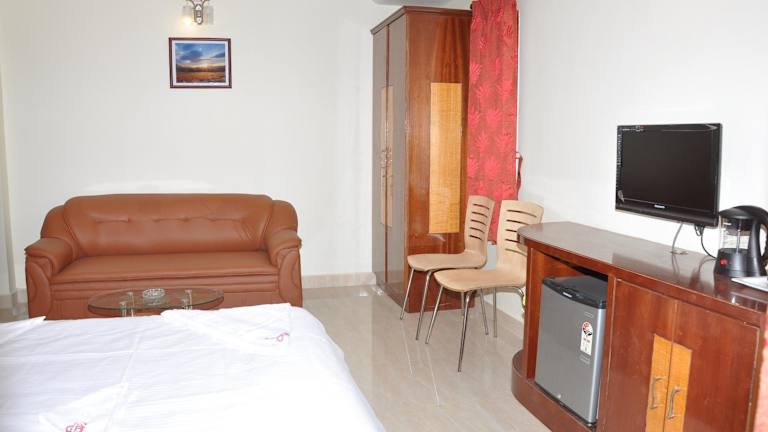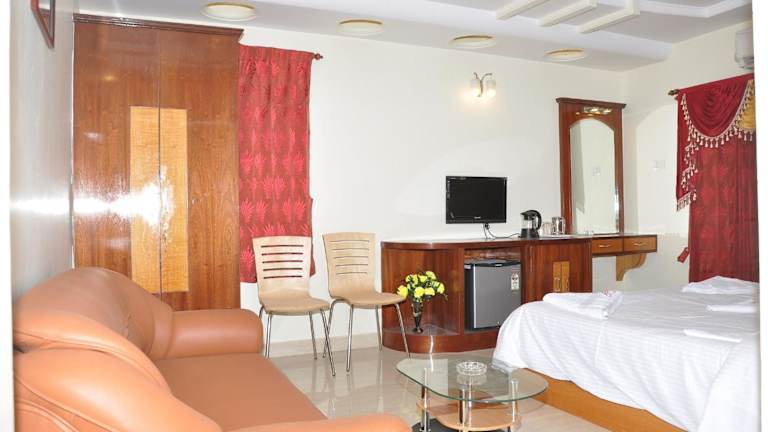 Die Zimmer im Sri Sarvesha JS Palace temple view sind schön dekoriert und klimatisiert. Sie bieten kostenfreies WLAN und Kabel-TV für die Unterhaltung der Gäste. Ein Kühlschrank ist ebenfalls vorhanden. Die Badezimmer sind mit kostenfreien Pflegeprodukten ausgestattet und bieten einen herrlichen Blick auf die umliegenden Berge.