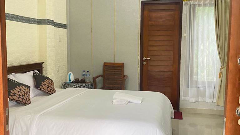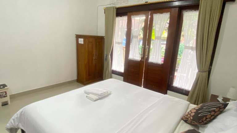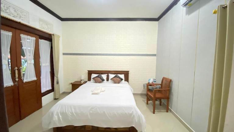Die Zimmer in der Unterkunft Sri Sedana Guest House sind mit einem Kleiderschrank, Bettwäsche und einem Balkon mit Blick auf den Garten ausgestattet. Zudem verfügen die Zimmer über einen Sitzbereich.