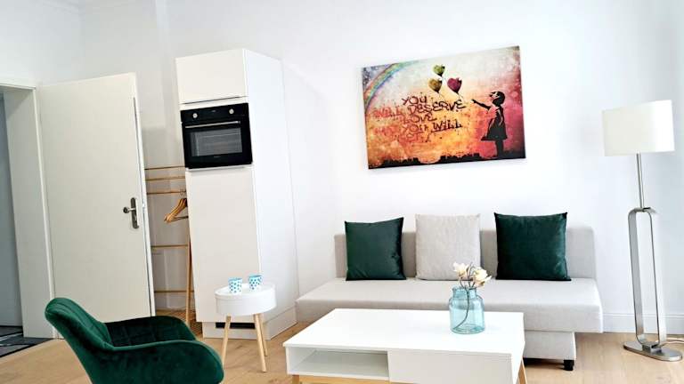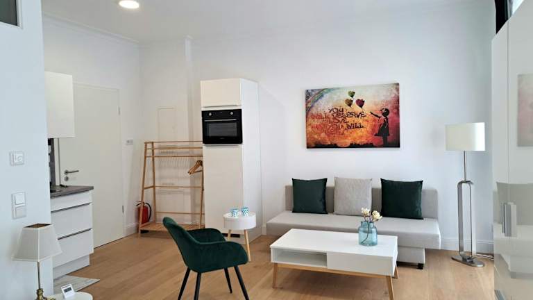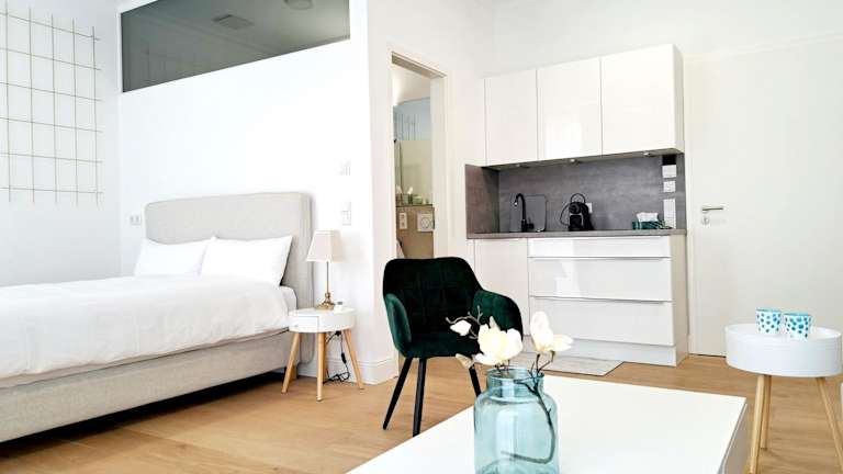 Die Ferienwohnung verfügt über ein Schlafzimmer sowie eine Küchenzeile, die mit einem Kühlschrank, einem Ofen und einer Kaffeemaschine ausgestattet ist. Handtücher und Bettwäsche werden bereitgestellt.