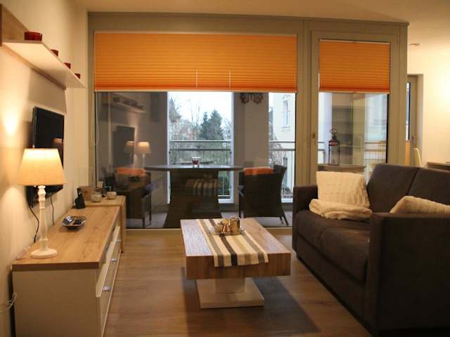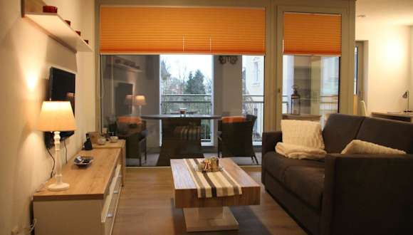 Die Ferienwohnung verfügt über ein Wohnzimmer mit Sitz- und Essbereich, ein Schlafzimmer sowie ein Badezimmer, das mit Dusche und Badewanne ausgestattet ist. Eine voll ausgestattete Küche mit Kühlschrank, Geschirrspüler und Ofen ist ebenfalls vorhanden. Handtücher und Bettwäsche werden bereitgestellt.