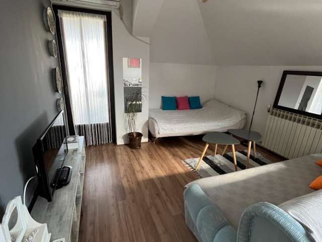 Die Ferienwohnung beinhaltet ein Schlafzimmer, einen Fernseher, eine Klimaanlage sowie ein Wohnzimmer.
