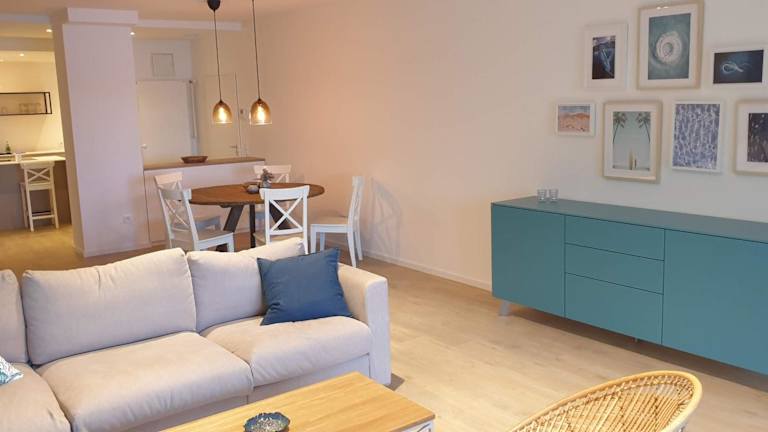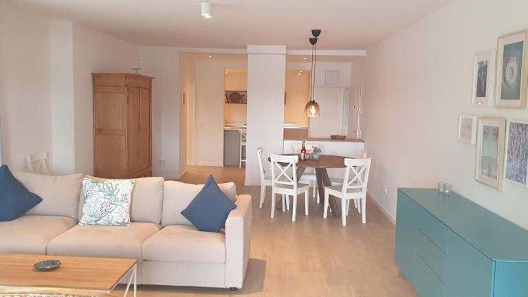 Die Ferienwohnung ist mit zwei Schlafzimmern ausgestattet und verfügt über eine Küche mit Kühlschrank und Geschirrspüler. Ein Flachbild-TV und ein Sitzbereich sind ebenfalls vorhanden. Zu den zwei Badezimmern gehört eine Dusche, und Handtücher sowie Bettwäsche werden bereitgestellt.