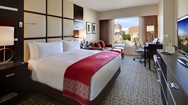 Die Zimmer und Suiten im The Statler Hotel sind stilvoll eingerichtet und bieten den Gästen einen komfortablen Rückzugsort. Mit Annehmlichkeiten wie einem 43-Zoll-LCD-TV, einer Kaffeemaschine und kostenfreien Pflegeprodukten ist alles vorhanden, um den Aufenthalt so angenehm wie möglich zu gestalten. Die meisten Zimmer verfügen zudem über einen Schreibtisch, der ideal für Geschäftsreisende ist. Bademäntel sind in allen Zimmern vorhanden, um den Gästen zusätzlichen Komfort zu bieten.