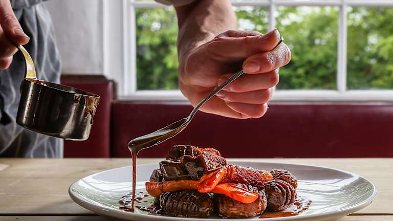 Im eleganten Restaurant wird klassische britische Küche serviert, die aus saisonalen und regionalen Zutaten zubereitet wird. Die Bar bietet eine Auswahl an einzigartigen Ales sowie eine große Auswahl an erlesenen Weinen aus aller Welt. Weitere Verpflegungsmöglichkeiten umfassen spezielle Ernährungsbedarfe auf Anfrage.