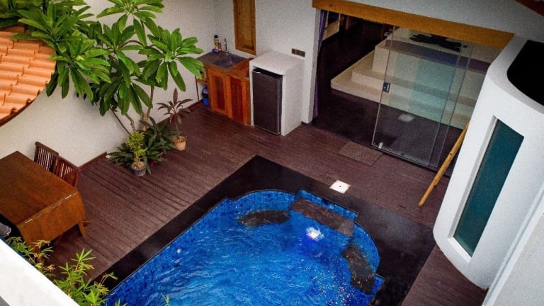 Die Villen im Stay Shark Villas Gili Air sind geräumig und elegant eingerichtet. Jede Villa verfügt über einen eigenen Pool, in dem Sie sich erfrischen können, sowie einen Flachbild-TV und einen gemütlichen Sitzbereich. Eine Küchenzeile mit einem Kühlschrank ist ebenfalls vorhanden, so dass Sie Ihre eigenen Mahlzeiten zubereiten können. Das Badezimmer ist modern und gut ausgestattet.