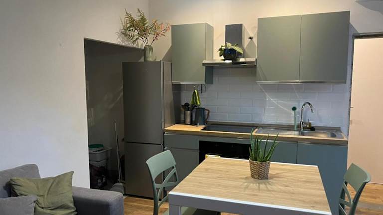 Die Küche ist ausgestattet mit einem Kühlschrank, Geschirrspüler, Ofen, Kaffeemaschine und Wasserkocher. Ein Café ist vor Ort verfügbar.