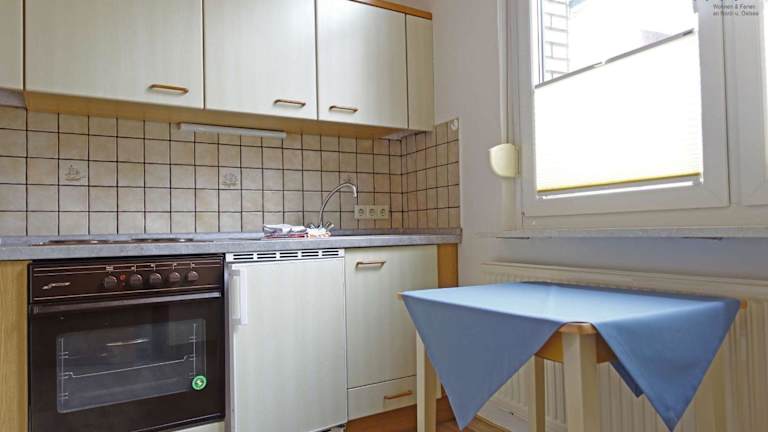 Die Ferienwohnung bietet eine Küche, die mit einem Kühlschrank und einem Ofen ausgestattet ist, wodurch eine Selbstverpflegung möglich ist.