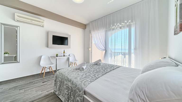 Die Zimmer verfügen über Klimaanlage und Heizung, eine Kochnische mit Kühlschrank, Herd und Mikrowelle sowie einen großen Balkon mit Meerblick. Jede Unterkunft ist mit einem Kingsizebett, einem Sofabett, einer Minibar, einem TV-Gerät, einem Radio und WiFi ausgestattet. Die Badezimmer bieten eine Dusche und eine Badewanne. Familien- und Nichtraucherzimmer sind verfügbar.