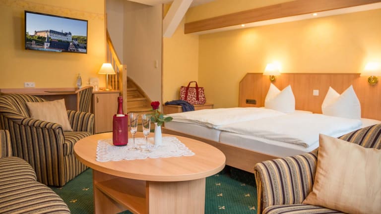 Die gute Stube in Stolberg offenbart Ihnen den schönsten Blick auf das Ensemble der Fachwerkstadt. Modern eingerichtete Zimmer kombinieren sich mit rustikalem Landhausstil und viel Raum für Geborgenheit. Es gibt unterschiedliche Varianten der Einrichtung. Vom Einzelzimmer zum Appartement bis zur Ferienwohnung haben wir alle Möglichkeiten für Sie im Angebot. Hoteleigene Parkplätze befinden sich hinter dem Haus.
