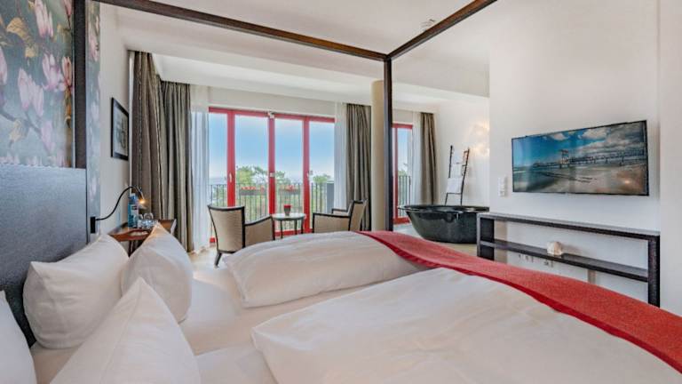 Unsere Hotelanlage verfügt über 89 stilvoll ausgestattete Zimmer in drei miteinander verbundenen Gebäuden, zum Teil mit herrlichem Seeblick. Bei uns fühlen Sie sich garantiert sofort wohl. Alle modern und komfortabel ausgestatteten Zimmer verfügen über SAT-TV, Telefon, Minibar, Safe, DU/Bad/WC und Balkon oder Terrasse. Aus manchen Zimmern blicken Sie aus der Badewanne direkt auf die Ostseewellen.