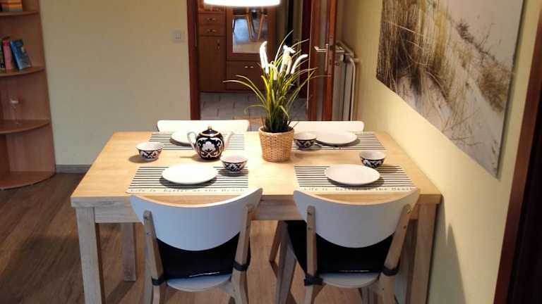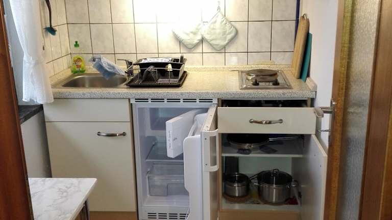 Die Ferienwohnung umfasst zwei Schlafzimmer, ein Wohnzimmer und eine voll ausgestattete Küche mit Kühlschrank und Kaffeemaschine. Das Badezimmer ist mit einer Dusche und einem Haartrockner ausgestattet. Auf Wunsch können Handtücher und Bettwäsche gegen Aufpreis bereitgestellt werden.