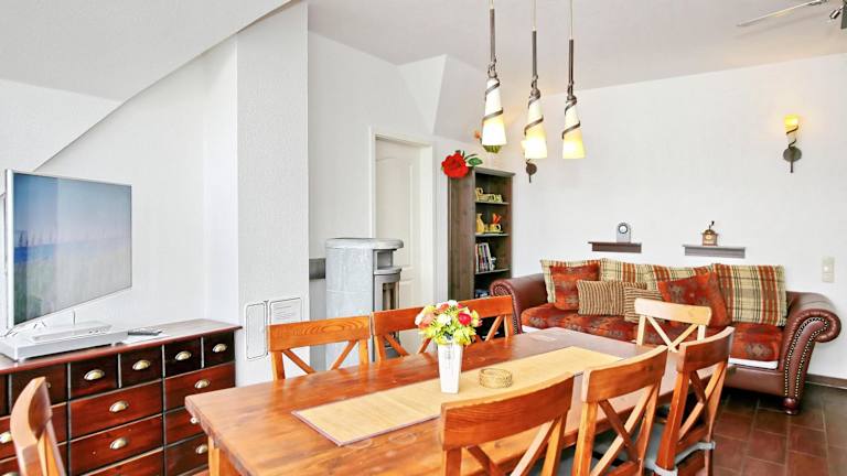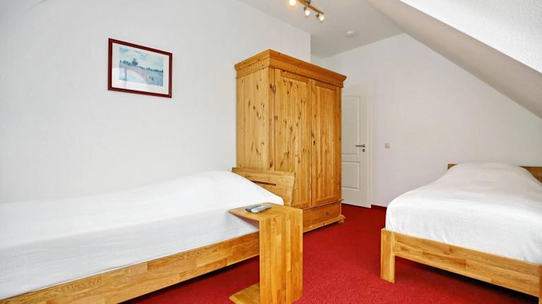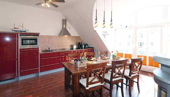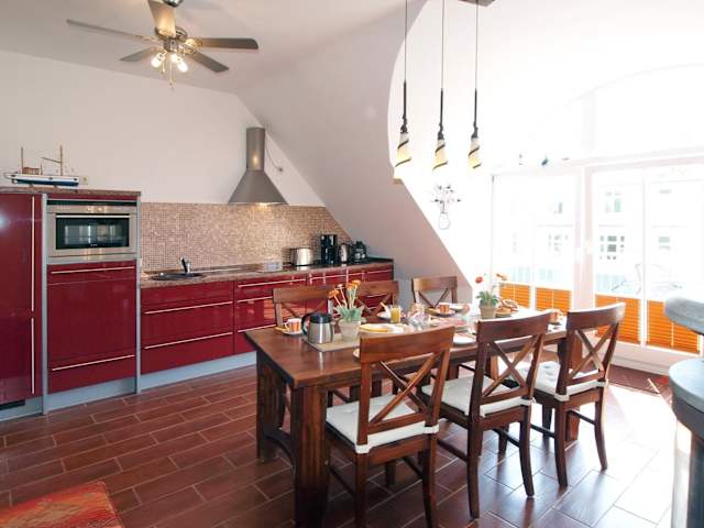 Die Ferienwohnung umfasst 2 Schlafzimmer und ist mit einem TV sowie einer voll ausgestatteten Küche ausgestattet. Zu den Küchenelementen gehören ein Kühlschrank, Geschirrspüler, Waschmaschine, Ofen und Herdplatte. Die Bereitstellung von Bettwäsche und Handtüchern ist nicht im Preis inbegriffen, diese können gegen Gebühr gemietet oder selbst mitgebracht werden.