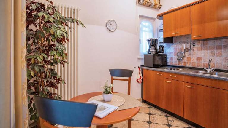 In der Ferienwohnung befindet sich eine Küche, die mit einem Kühlschrank und einer Mikrowelle ausgestattet ist. Handtücher und Bettwäsche werden bereitgestellt.