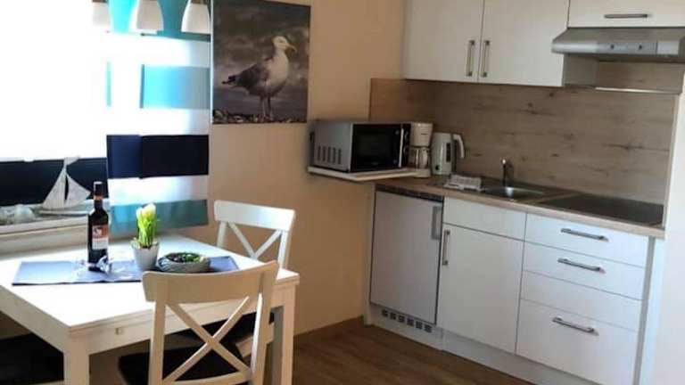 Die Ferienwohnung besteht aus einem Schlafzimmer, einem Wohnzimmer und einer voll ausgestatteten Küchenzeile, die mit Kühlschrank und Kaffeemaschine ausgestattet ist. Zudem verfügt die Wohnung über ein Badezimmer mit Dusche und Haartrockner. Handtücher und Bettwäsche werden bereitgestellt.