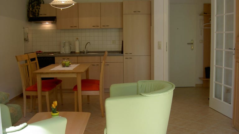 Die 2-Raum-Appartements 4 + 6 befinden sich im 1. OG und haben je 2 Balkone. Die 2-Raum-App. 7 + 8 befinden sich im Dachgeschoss des Hauses. 7 hat 2 und App. 8 1 Balkon. Das 2-Raum-App. 2 befindet sich im EG mit einer Terrasse. Die Nichtraucherappartements sind modern und geschmackvoll eingerichtet und sind jeweils nur für max. 2 Personen buchbar.