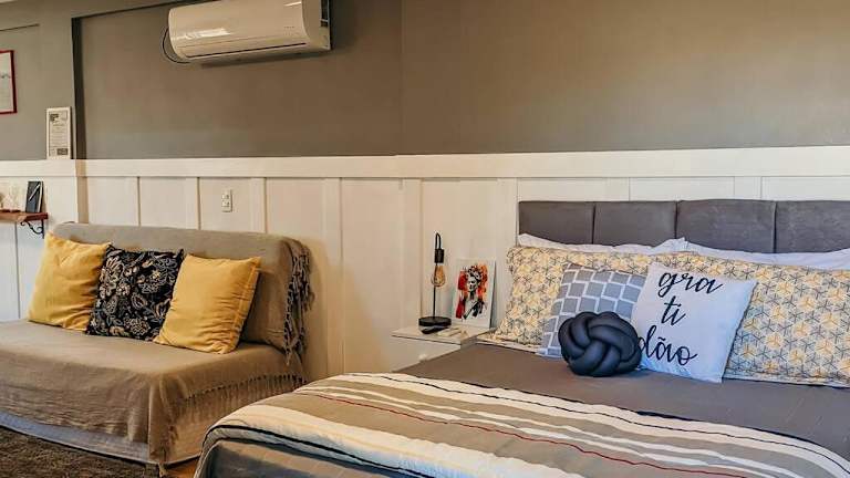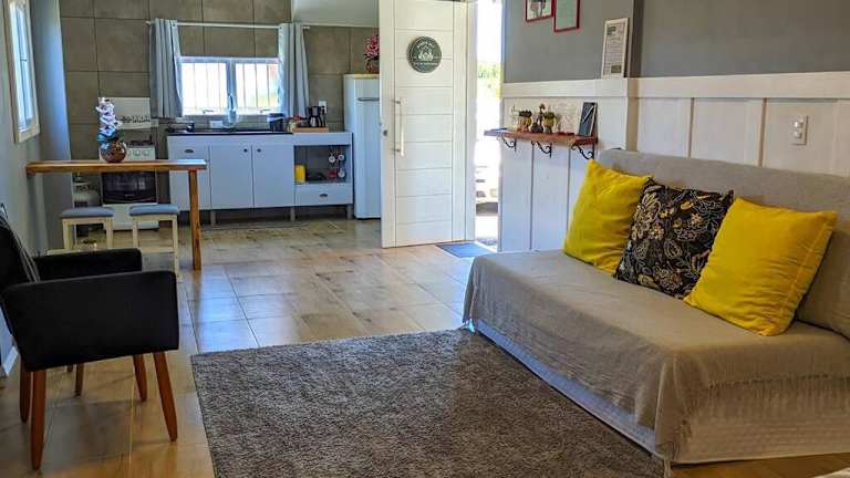 Das Ferienhaus setzt sich aus einem Schlafzimmer, einem Wohnzimmer, einer voll ausgestatteten Küche mit Kühlschrank und Wasserkocher sowie einem Badezimmer mit Dusche und kostenlosen Pflegeprodukten zusammen. Handtücher und Bettwäsche werden bereitgestellt.