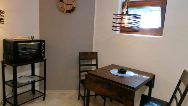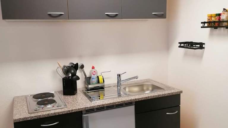 In der Unterkunft steht eine Küchenzeile zur Verfügung, die mit einem Kühlschrank, einem Ofen, einer Herdplatte, einer Kaffeemaschine und einem Wasserkocher ausgestattet ist, sodass die Gäste die Möglichkeit haben, eigene Mahlzeiten zuzubereiten.